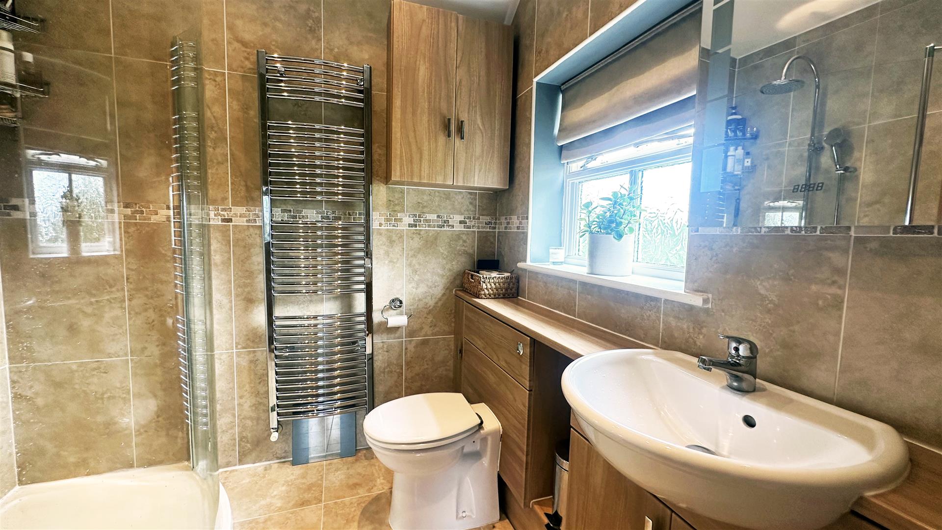 multi-generational living, with views to the front of the property and a feature window into the reception hallway. To the rear side of the property, there is a boot room with a separate outside entrance, leading to a downstairs accessible shower room and laundry. The staircase from the entrance hallway leads to a large landing area, from which the family bathroom and all bedrooms are accessed. The master bedroom features a large double glazed sash window, looking out over the front elevation, and leads to a dressing room with built in wardrobes and en-suite shower room. Bedroom 2 features double aspect views across the rear and to the side of the property, with built in wardrobes, and an en-suite shower room. Bedrooms 3 and 4 are both double bedrooms, featuring built in wardrobes. Bedroom 5, currently used as a hobby room, has views looking out over the side elevation of the house. A separate two storey garage / annexe sits to the rear of the property and is fitted with its own electrical heating system, running water and lighting. Downstairs there is a kitchenette, and downstairs washroom, plumbed ready for shower installation. Stairs lead to the first floor attic space, carpeted and fitted with radiators and electrical sockets, this space provides the opportunity for a home office or standalone living accommodation (subject to planning).